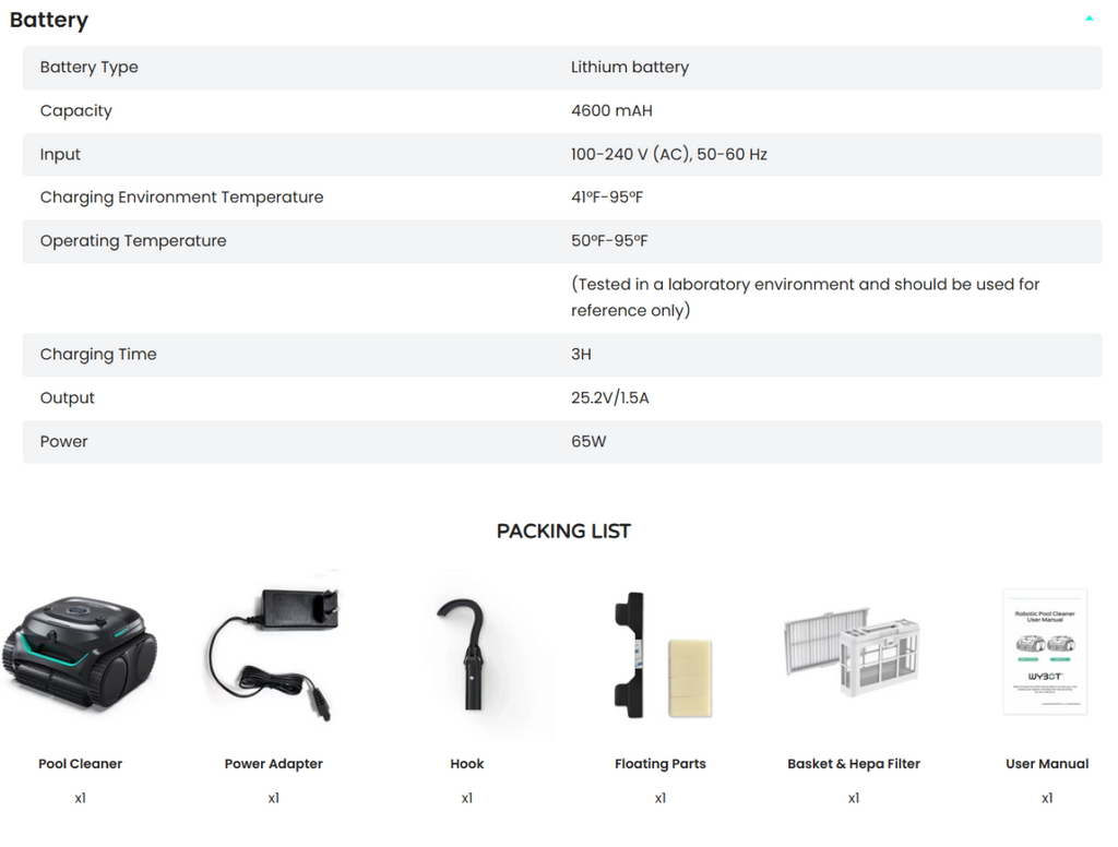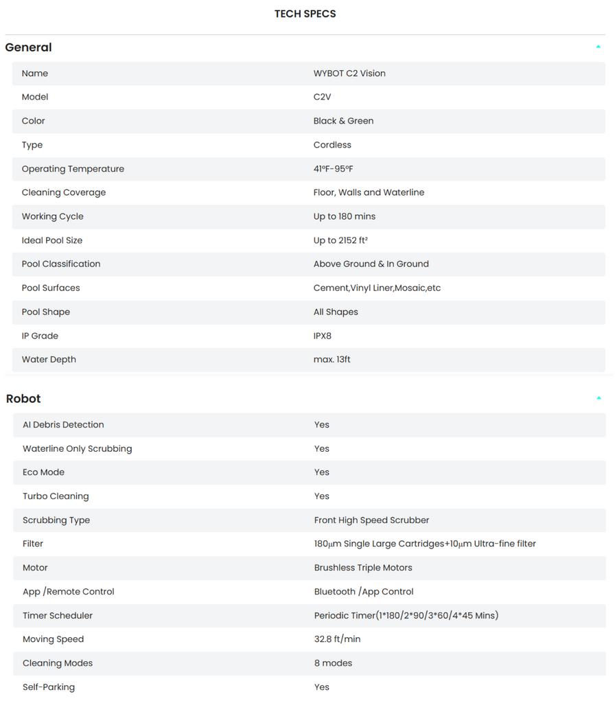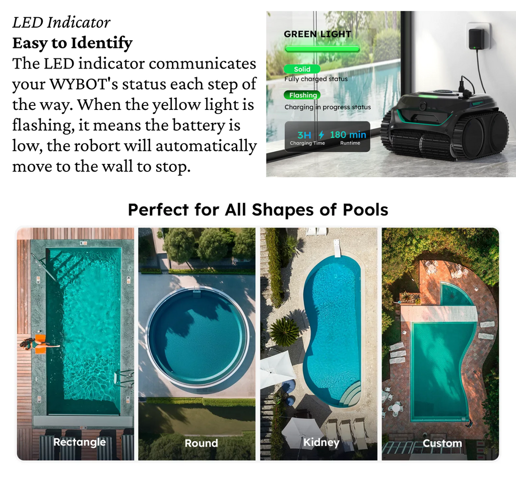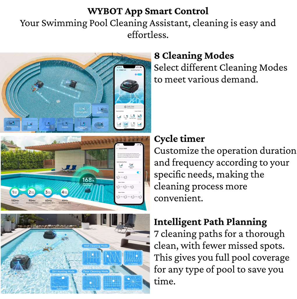 - Smart Cleaning Customization: Control 8 cleaning modes and 6 paths through the WYBOT App—including VISION, Full, Floor, Wall, Waterline-only, Wall then Floor, Turbo, and Eco modes.