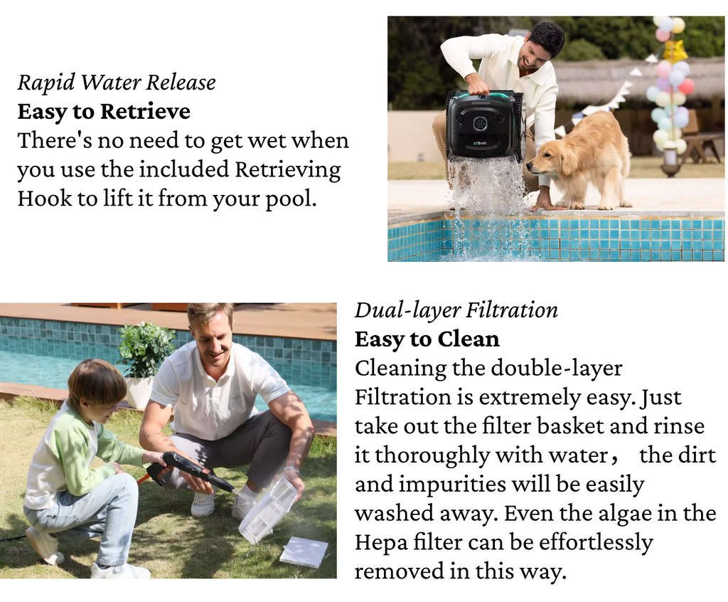 - Advanced Dual Filtration: Combines 180μm large-particle cartridges with 10μm ultra-fine filters to trap debris of all sizes, from leaves to fine particles.