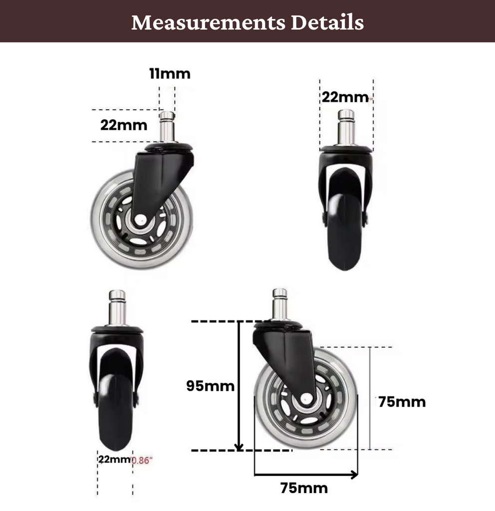 FIT MOST CHAIRS – The stem size of our desk chair wheels is 11mm x 22mm, which means they are compatible with almost all chairs. However, if you have an odd-sized chair or an IKEA chair, then these wheels would not be compatible with yours. Pls measure your old wheels again to ensure it can fit yours.