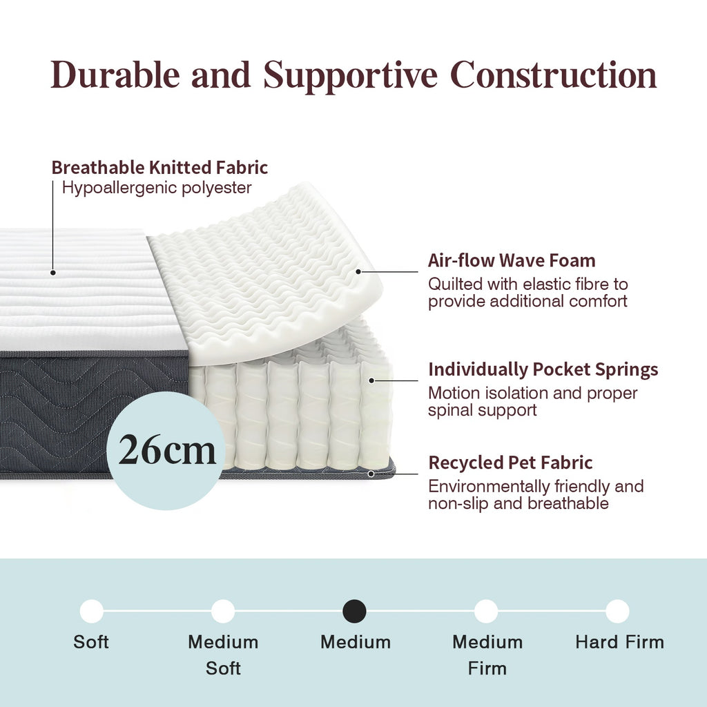 Upgrade your sleep with the NEWSTAR Comfort 26cm Pocket Spring Mattress — designed with hotel-grade materials for long-lasting comfort, excellent support, and a refreshing night’s rest.